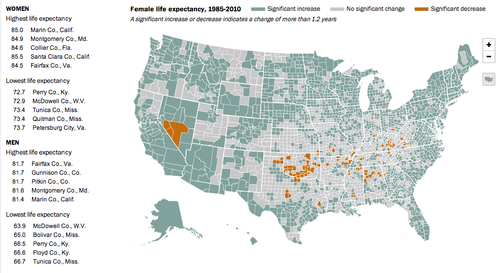 Since 1985, male life expectancy in U.S. counties has either improved or remains unchanged. However, some counties in the nation’s heartland have seen a significant decrease in female life expectancy, shown in orange on the map below.