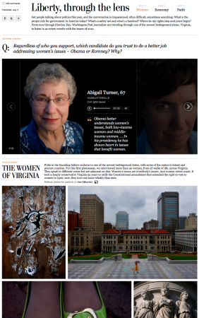 The Post has some of the best photojournalists in the world, and it’s always such a pleasure to work with them. For this three-part series on Virginia voters, Melina Mara took portraits of Virginians and interviewed them. Nick Kirkpatrick recorded and edited audio from the interviews. Then Bonnie Jo Mount traveled the state to photograph the themes: women, economy, and faith. Grace Koerber designed the beautiful package, and I was her editor. After she left the Post to go back to school for interior design, I handled the second two installments, putting together the mosaics and working on package branding. I love the slideshow and mosaic pattern Grace designed — it’s an inspiring way to do individual portraits and interviews. The ability to view images as a mosaic or in a full-screen gallery view is awesome.