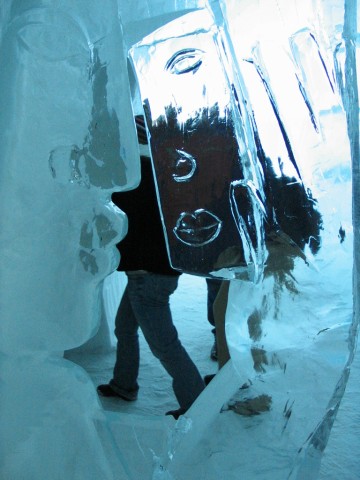 The first day we went to Jukkasjarvi, about 20 minutes south of Kiruna, to see the Icehotel! Ah! The Icehotel is like a giant igloo/ice museum/hotel. People can stay there but it is about 4000 SEK (krona = Swedish Crowns) for one night, and that is about $600-ridiculous. And if you stay at the icehotel then you don’t get your own bathroom and you freeze to death (it is warmer outside than inside, it is about -5 degrees inside at all times). Anyway, it was so beautiful. It was full of sculptures and there were some people getting married there and a baptism! (there is a chapel too, made of ice). There is an ice bar (sponsored by Absolut Vodka-a Swedish brand) where you can get a vodka drink in a glass made of ice! But of course we didn’t get a drink because one drink cost about $15. Artists from all over the world come to design the different rooms inside- one was a model of NYC with skyscraper sculptures and street signs, and one was a rock concert with a stage, guitar, microphone, and bar, all made of ice! There was beautiful ice chandelier also, it was absolutely beautiful.